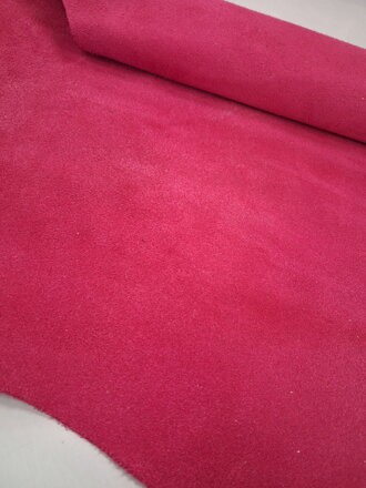 Hovädzí velúr cyklámenový má výmeru 0,89 m2, hrúbka kože je 1,4 mm. Cena za m2 je 18,- eur s DPH.